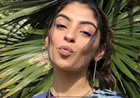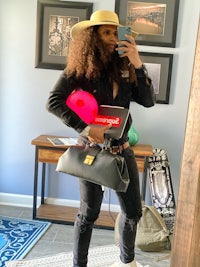 a woman in a hoodie holding a purple shopping bag