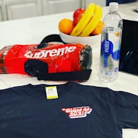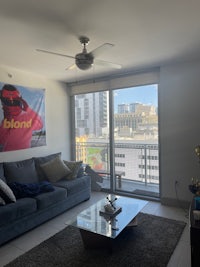 a young man standing on a balcony wearing black shorts and a headband