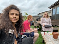 a woman sitting on a rock in the woods
